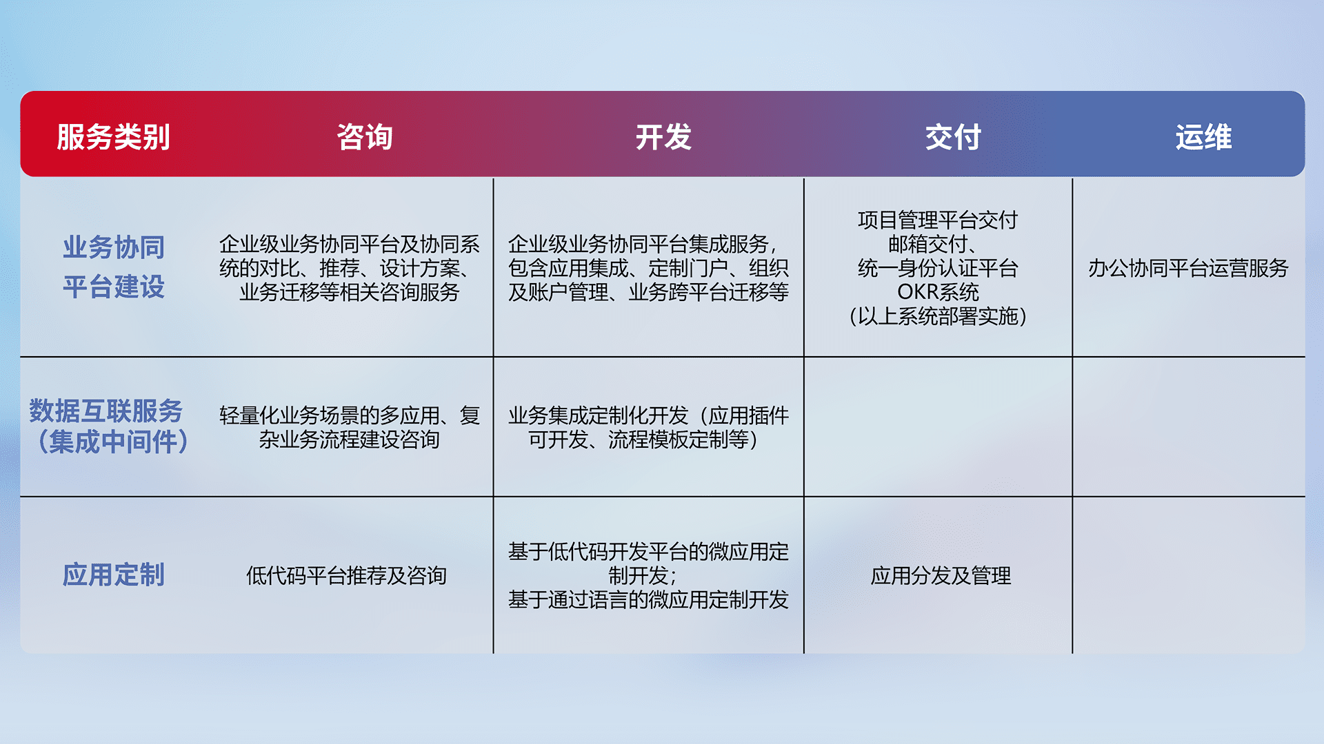 针对钉钉、、企微、、、IDaas等平台级产品提供产品的规划、、、、方案、、、交付、、、、定制化开发等服务,,,,实现如统一协同办公、、、智能客户服务、、、、混合会议管理、、智能数据查询、、、、等业务场景,,实现数字化转型。。